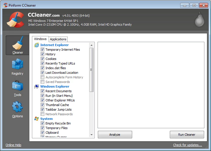 Antarmuka yang ramah pengguna tersusun rapi dengan tab-tab berlabel Cleaner, Registry, Tools, dan Options. Hal ini membuat navigasi Anda cepat dan mudah sekaligus menawarkan proses pemindaian dan pembersihan berkala, seperti: